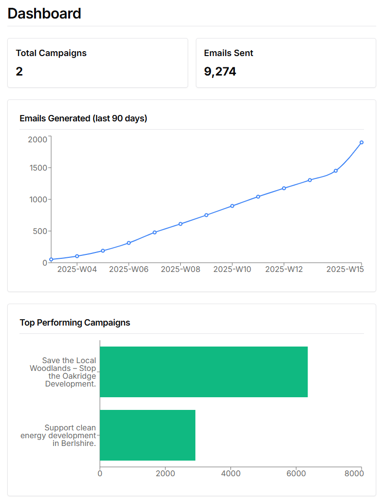 Create and monitor campaigns, embed MP search and message generation on your website. AI helps voters articulate their unique concerns in addition to your campaign messaging so their voices can be heard on issues that matter.