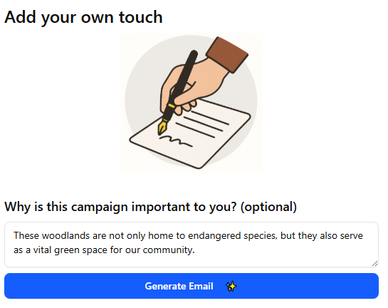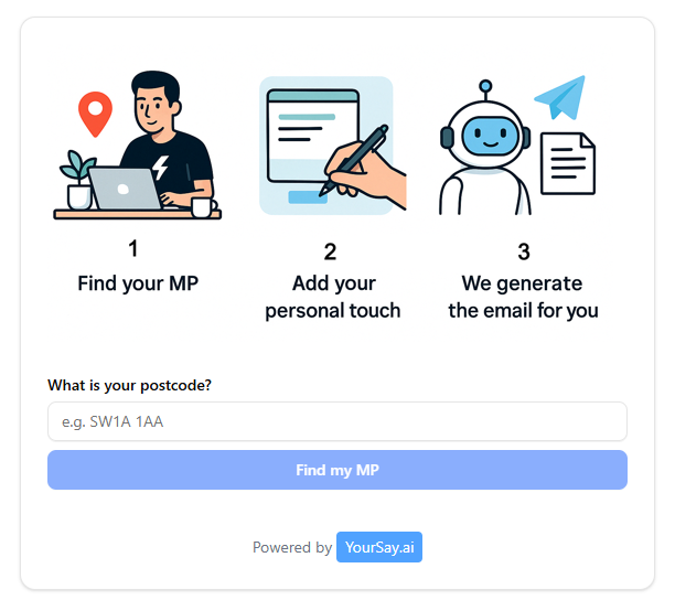 Create a campaign with just a description, drop our widget into your website and allow voters to easily search for their local MP and generate a bespoke draft message.